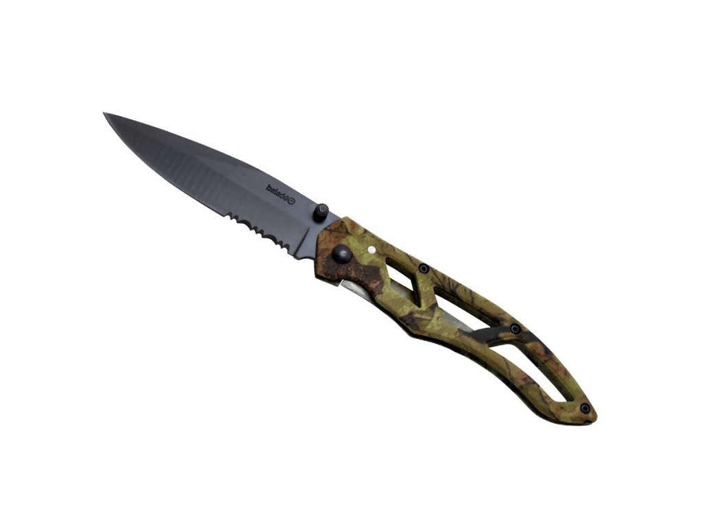 - Rukojeť s kamufláží: rukojeť z nerezové oceli je doplnění kamuflážními (maskovacími) vložkami, které zlepšují úchop a dodávají noži taktický vzhled.