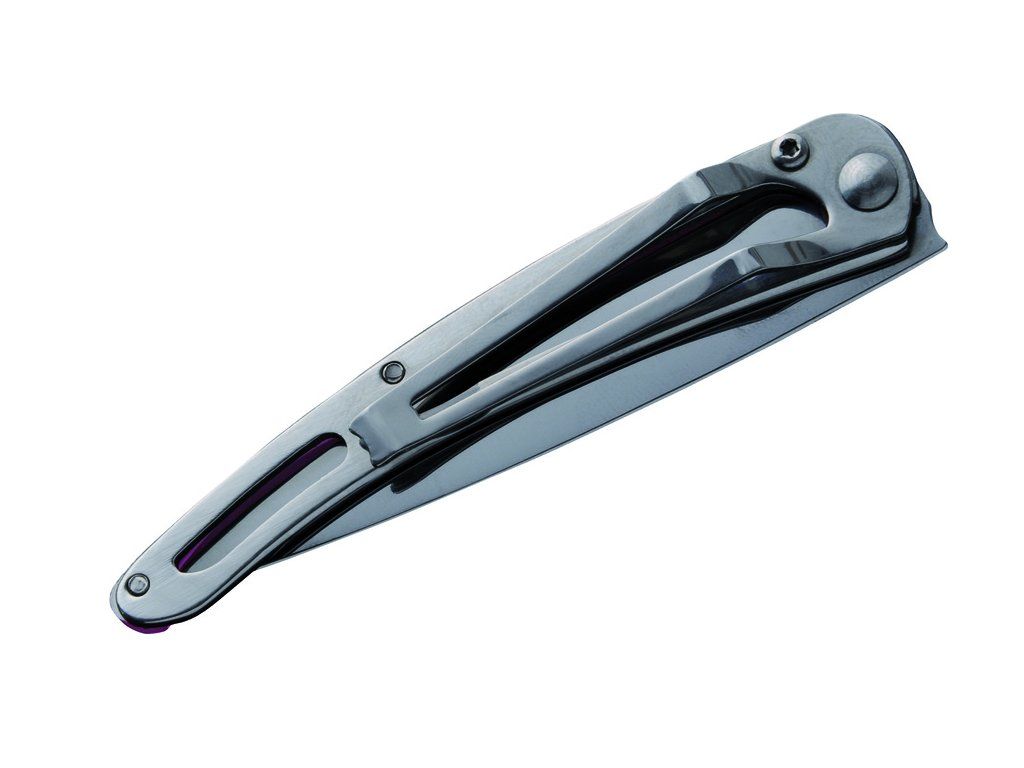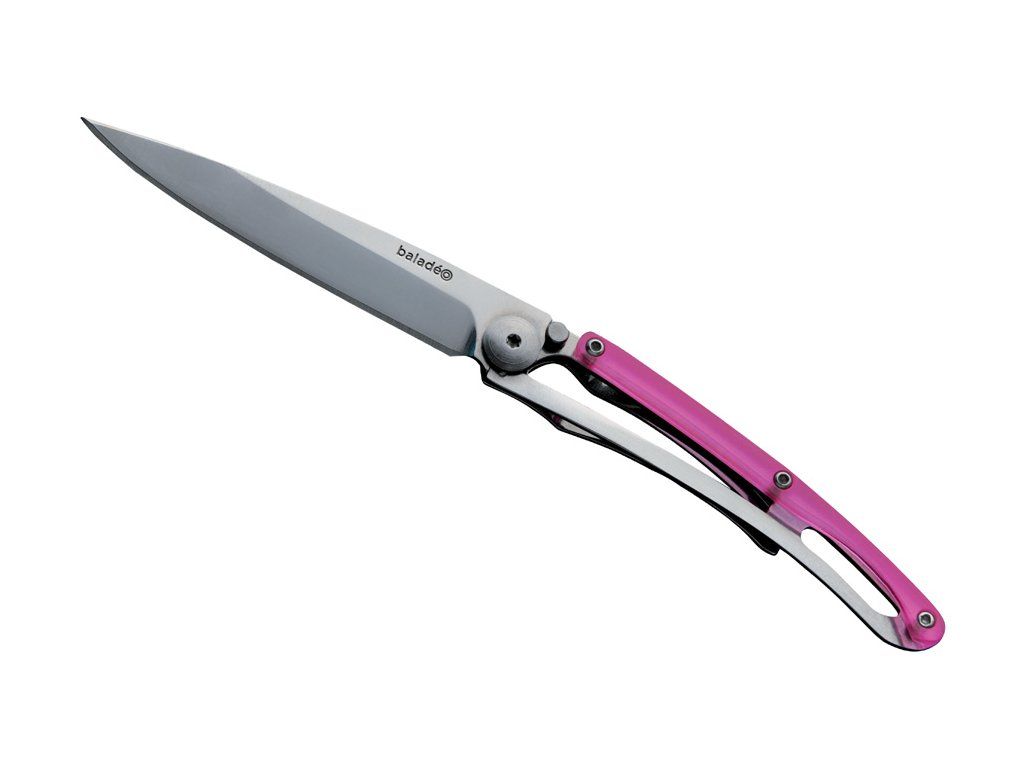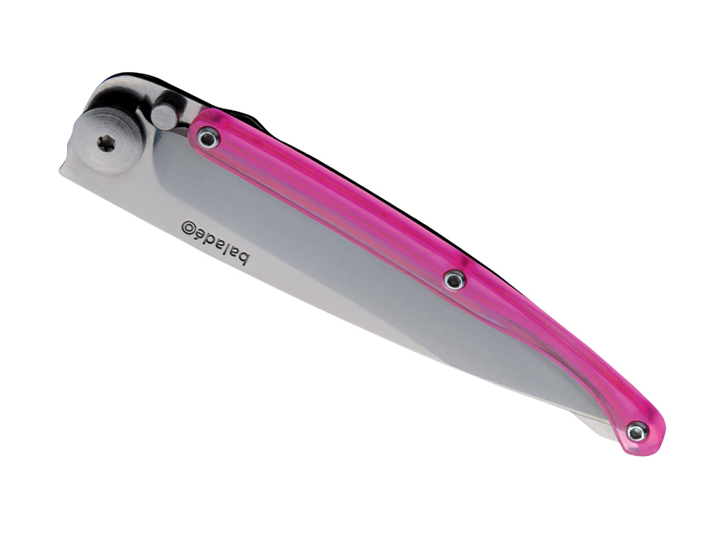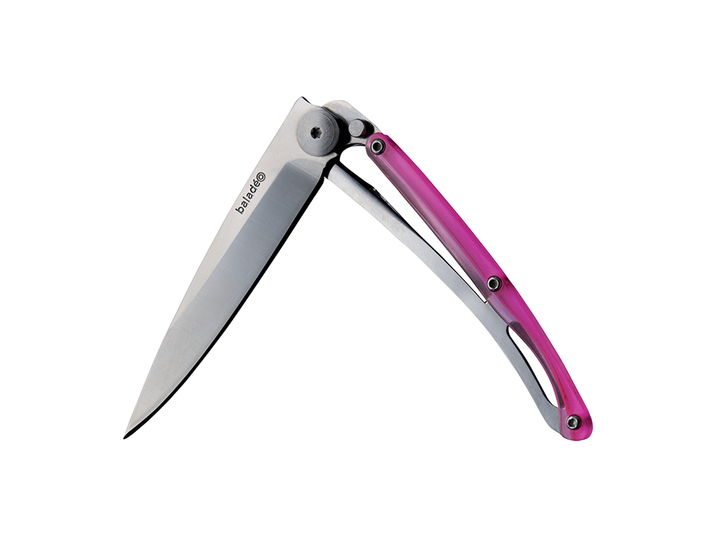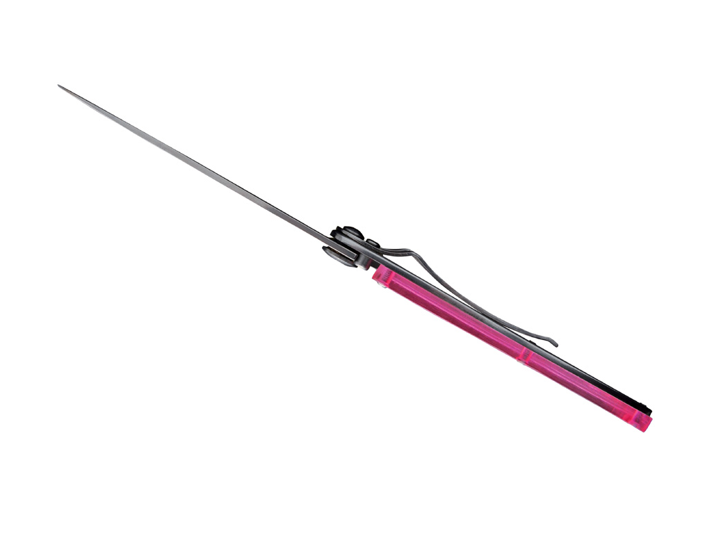 - Rukojeť z polykarbonátu: střenka je tvořena lehkým, ale vysoce odolným průhledným polykarbonátem v růžové barvě. Tento materiál snižuje celkovou hmotnost na minimum a zároveň dodává noži jedinečný a moderní vzhled.