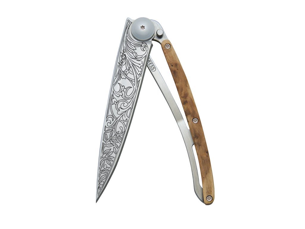 Stylový ultralehký nůž Deejo se střenkou z kořene exotického jalovce.