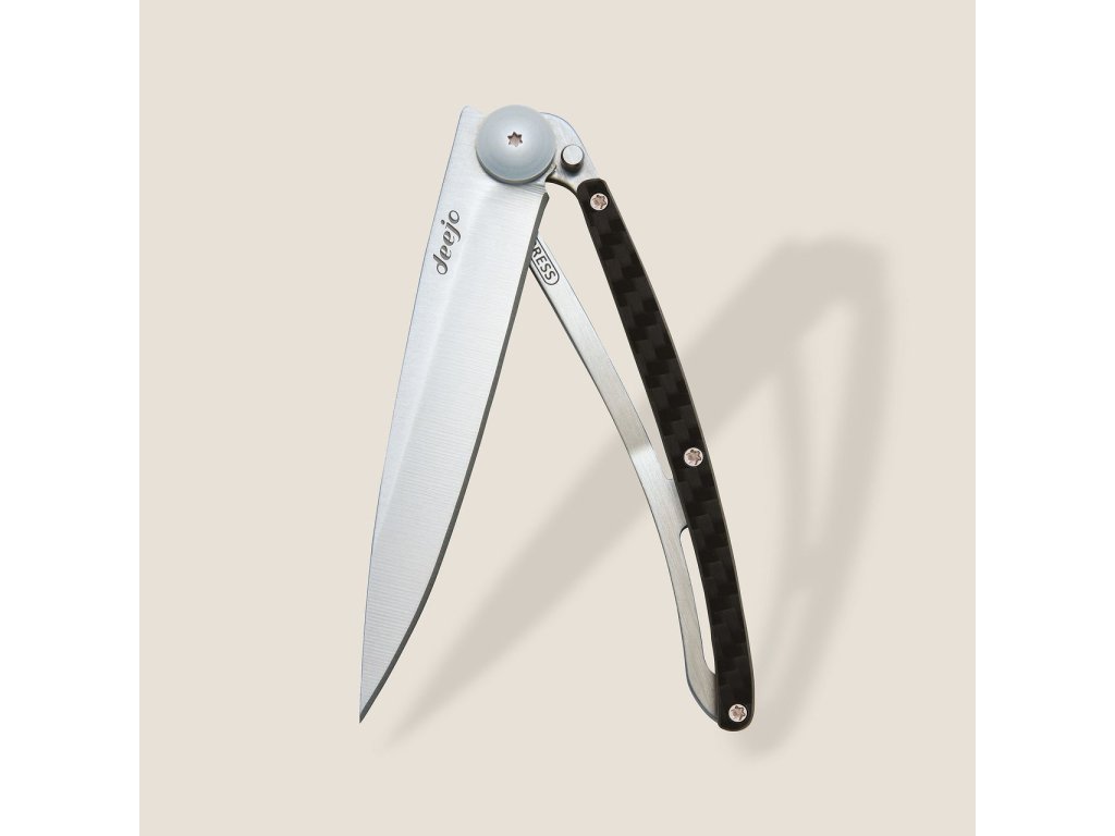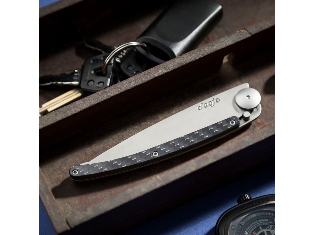 Stylový ultralehký nůž Deejo se střenkou z karbonu a čepelí s černým titanem.