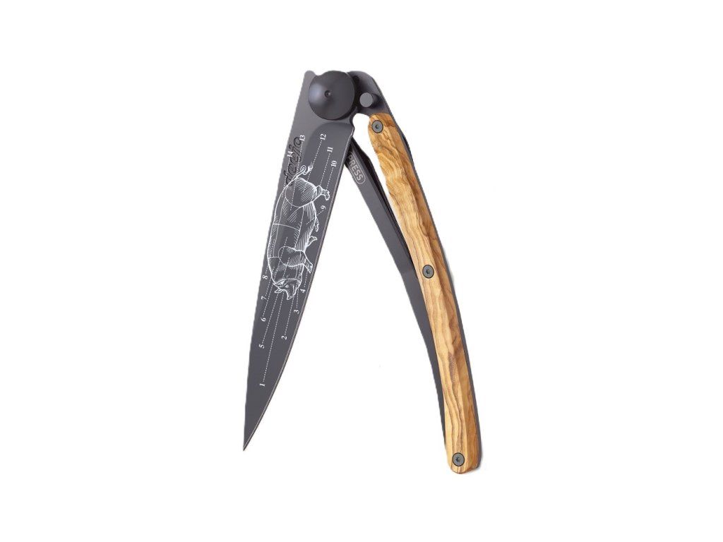 Elegantní černý titanový povrch je trvale gravírován laserem. Pro zachování ostrosti i tetovaného motivu používejte k dobrušování kapesní brousek deejo.