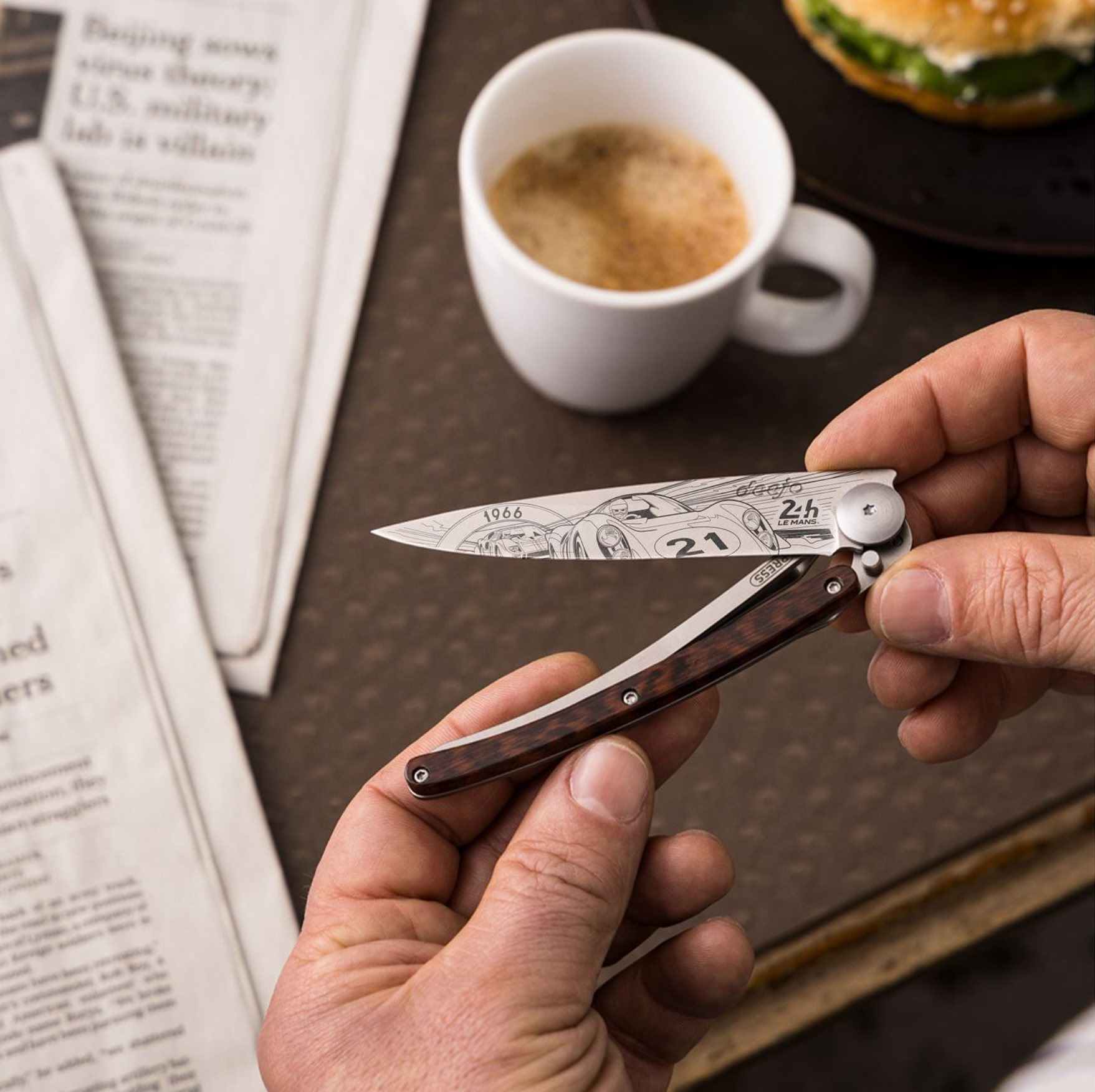 - Oboustranné tetování: Papazoglakisův styl je precizní, nervózní a intenzivně dynamický. Jeho kresba zdobí čepel z obou stran (recto-verso), což je u Deejo vzácný a prémiový prvek. Linky na čepeli evokují rychlost a dravost legendárního souboje Fordu a Ferrari v roce 1966, kdy americká síla poprvé pokořila italskou eleganci.