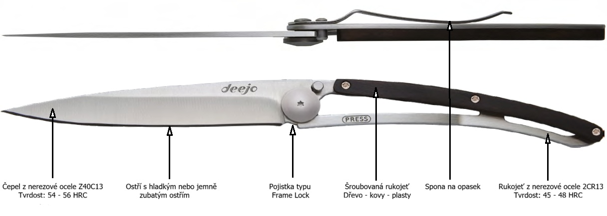 - Broušení: pro zachování ostrosti čepele a bezpečné broušení (abyste nepoškrábali povrch) doporučuje výrobce používat originální kapesní brousek Deejo.