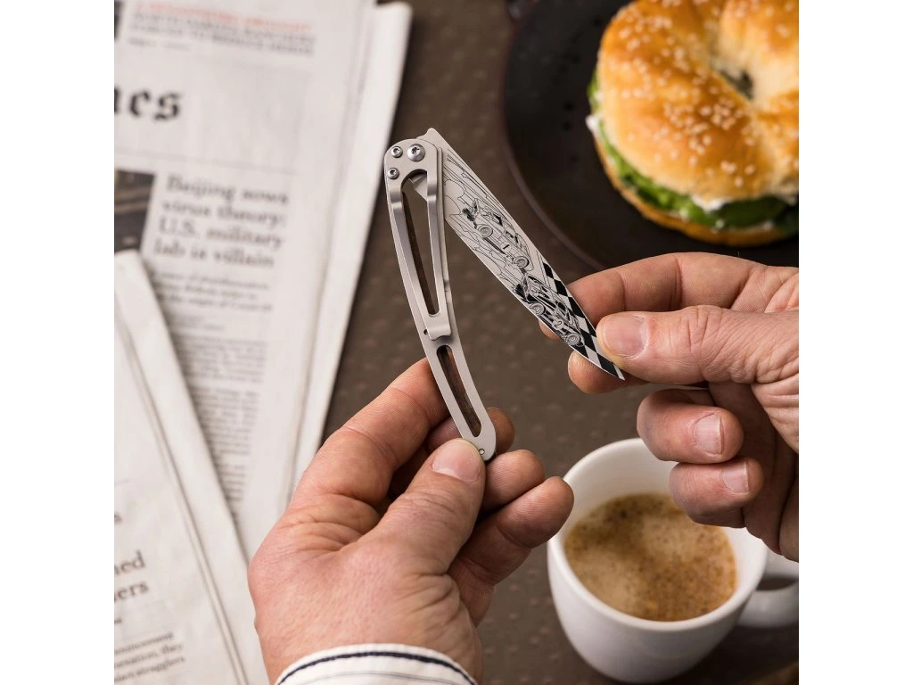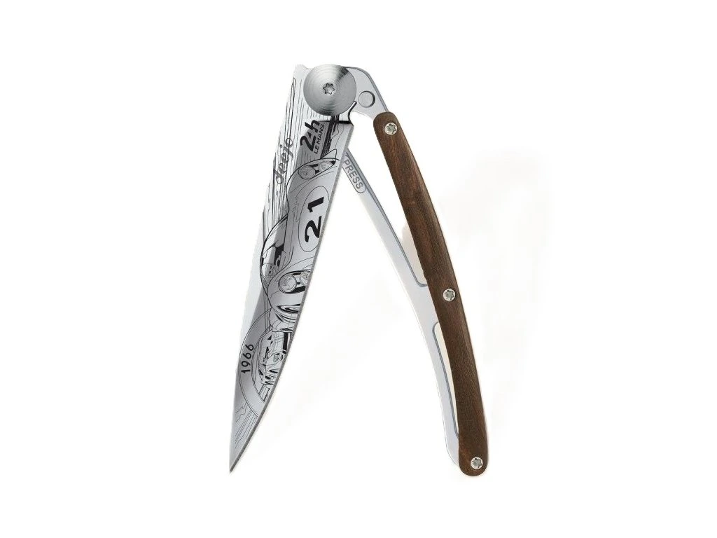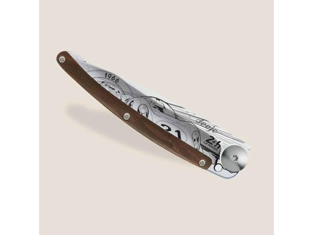 - Oboustranné tetování: Papazoglakisův styl je precizní, nervózní a intenzivně dynamický. Jeho kresba zdobí čepel z obou stran (recto-verso), což je u Deejo vzácný a prémiový prvek. Linky na čepeli evokují rychlost a dravost legendárního souboje Fordu a Ferrari v roce 1966, kdy americká síla poprvé pokořila italskou eleganci.
