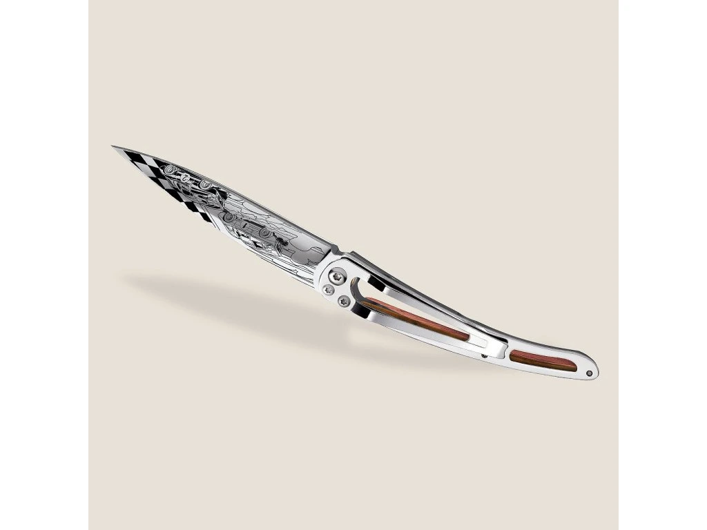 Tento nůž Deejo není jen nástrojem, je poctou tomuto momentu odvahy, inženýrského umu a vytrvalosti. Detailní laserové gravírování na čepeli zachycuje atmosféru tohoto ikonického závodu, čímž se stává sběratelským kouskem pro každého milovníka rychlých kol a historie.
