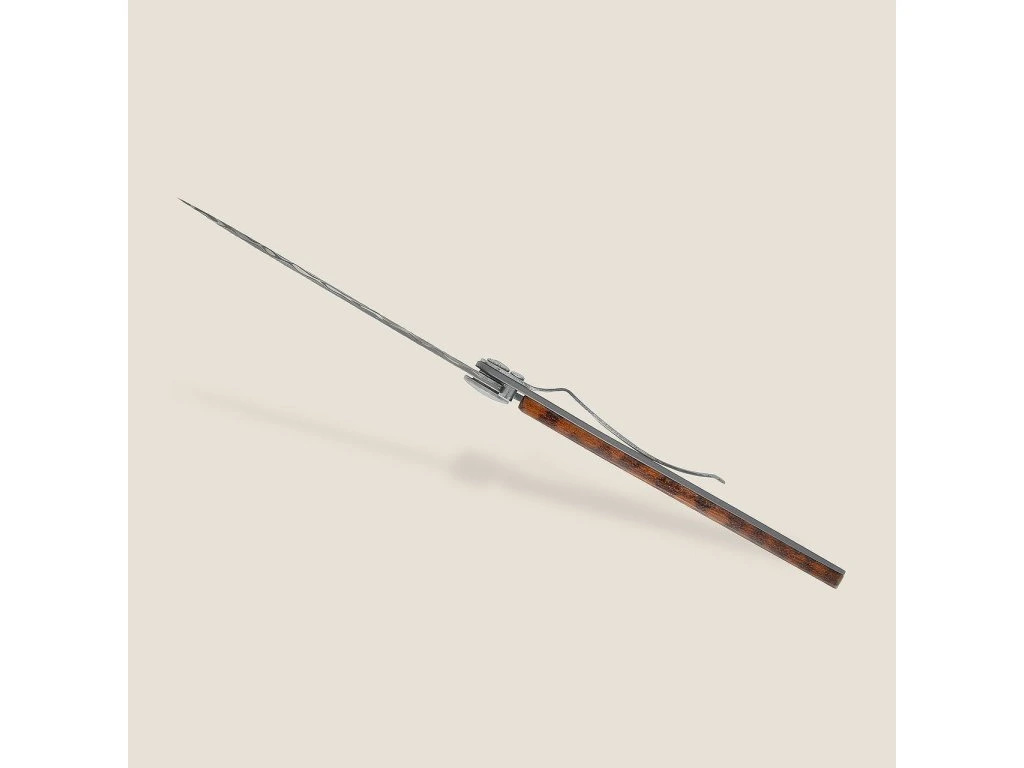 Rukojeť: střenka je vyrobena z exkluzivního dřeva Snakewood (známého také jako Amourette nebo "hadí dřevo"). Toto vzácné dřevo z Jižní Ameriky je ceněno pro svou extrémní tvrdost, odolnost a především unikátní kresbu připomínající hadí kůži. Každý kus je díky tomu originál.