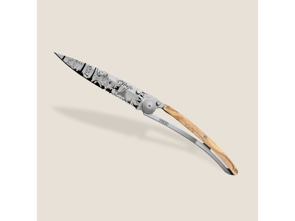 Elegantní matný titanový povrch je trvale gravírován laserem. Pro zachování ostrosti i tetovaného motivu používejte k dobrušování kapesní brousek deejo. Zoubkaté ostří.