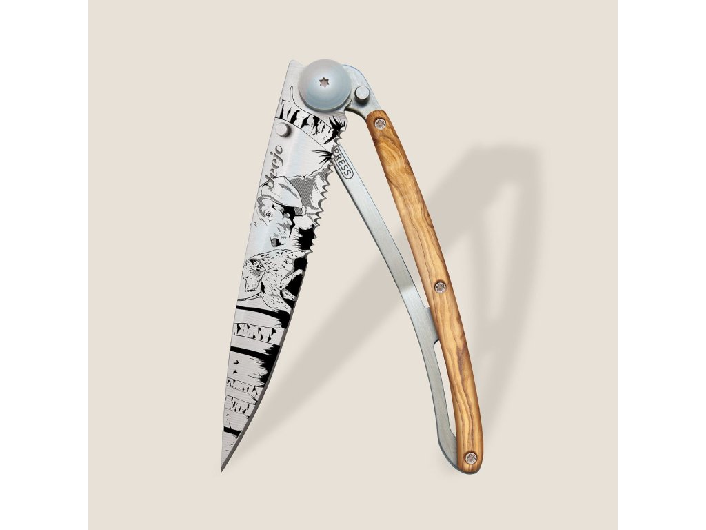 Kapesní nůž Deejo 1CB514 Tattoo Serration 37g olive wood Hunting Day