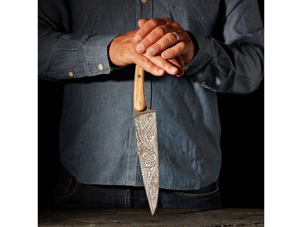 - Význam motivu Triskell: tento starověký keltský symbol tří spojených spirál vyrytý do čepele představuje dynamiku, pohyb a nekonečný životní cyklus (či propojení země, vody a nebe). Do vaší kuchyně vnese symbolickou rovnováhu a energii k tvorbě nových pokrmů.