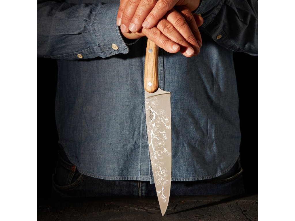 - Střenka z olivového dřeva: masivní a pevně nýtovaná rukojeť je z olivového dřeva. To vyniká nejen úžasnými teplými odstíny (od béžové po sytě medovou), díky kterým je každý kus jedinečný, ale také svou robustností a přirozenou antibakteriální povahou.