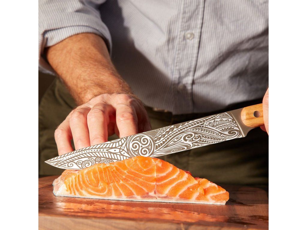 - Význam motivu Triskell: starověký keltský symbol tří spojených spirál vygravírovaný do čepele vnáší do designu dynamiku a pohyb. Na tomto porcovacím noži symbolizuje plynulost, energii a naprostou kontrolu, která je při přesném plátkování klíčová.