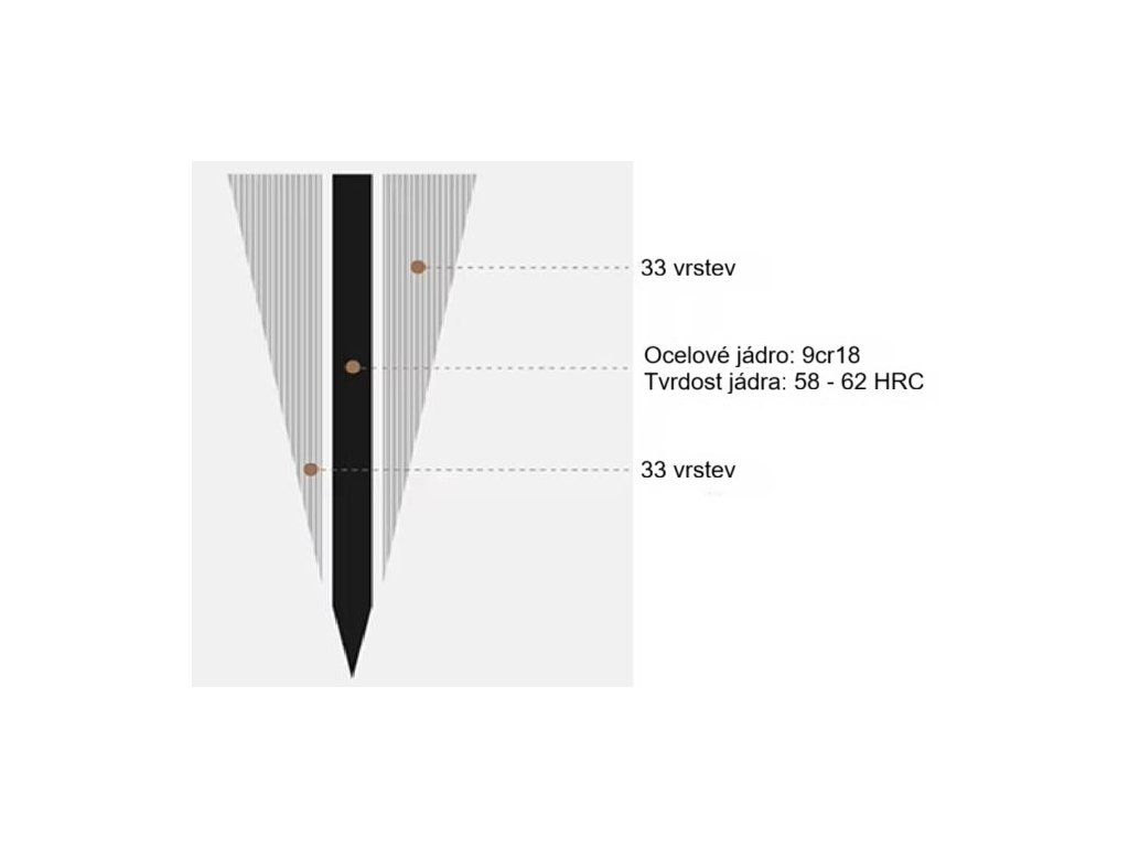 - Prémiová damašková čepel: je tvořena celkem 67 vrstvami (kombinace ocelí 304 a 3CR13), které obepínají tvrdé jádro z oceli 9CR18, čímž vzniká fascinující a naprosto unikátní vlnitý vzor.