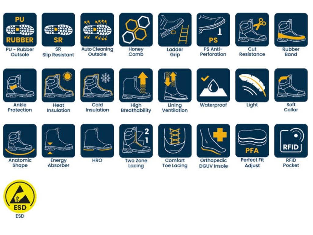- Podešev: s mezipodešví z EVA a běhounem z nitrilové pryže, poskytuje maximální komfort, absorpci nárazů, je antistatická a ESD. Odolává kontaktnímu teplu až do 300°C (HRO) a má vysokou protiskluznost. Je odolná proti opotřebení, olejům a uhlovodíkům.